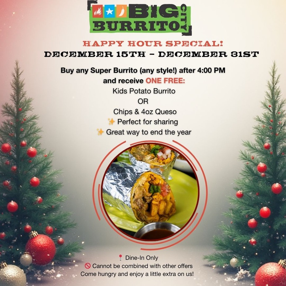 Buy ANY Super Burrito (any style!) after 4:00 PM and get ONE FREE: